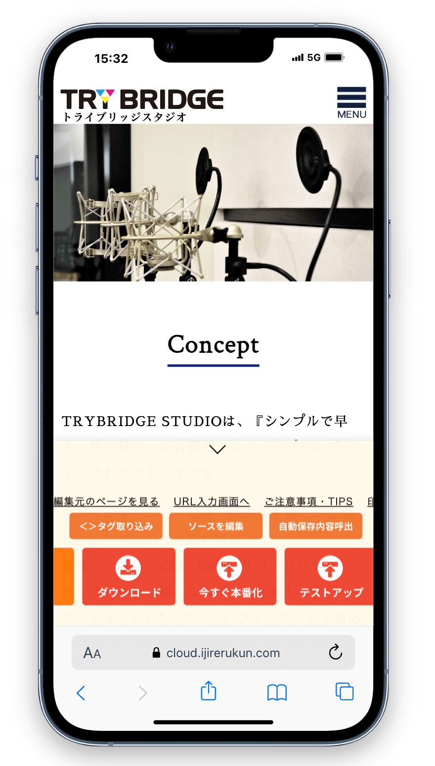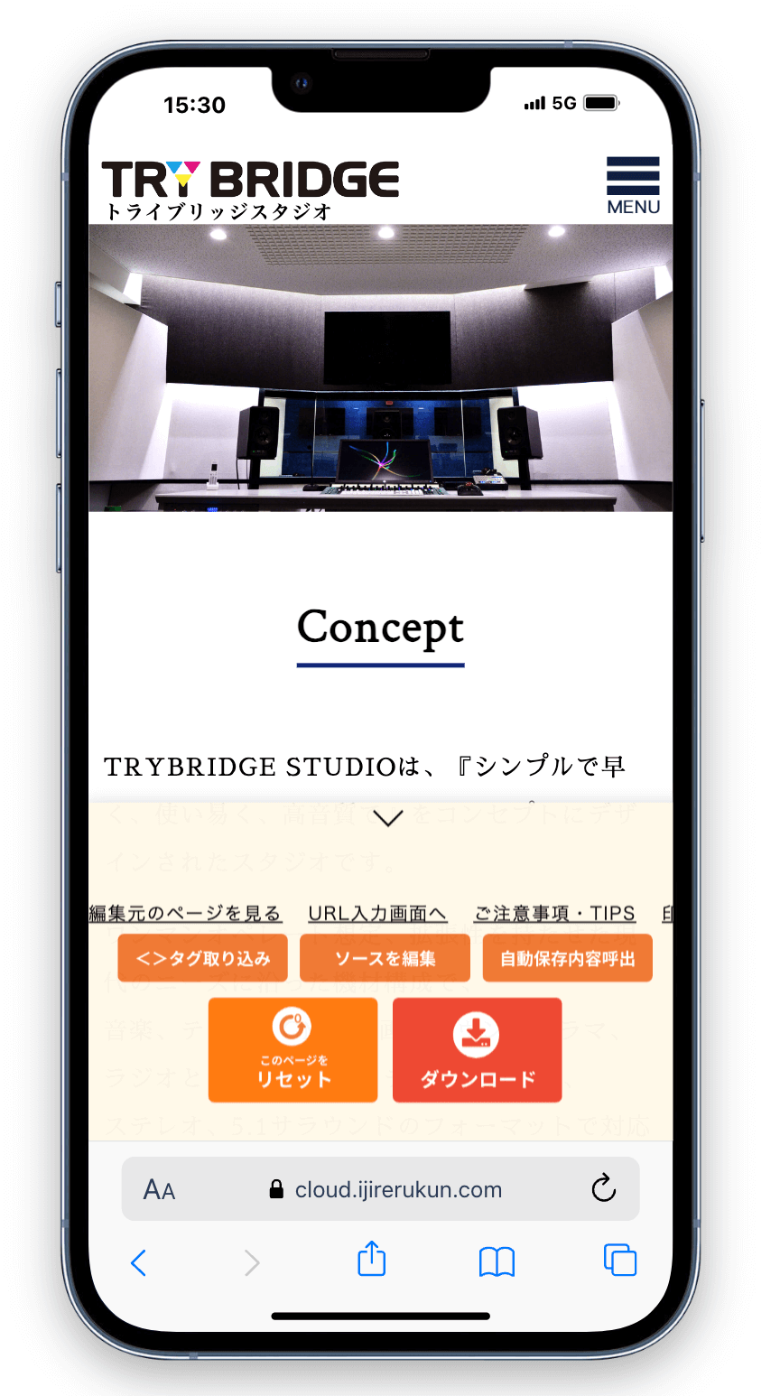 ではでは早速ホームページいじれるくん®︎FREEにURLを入れてっと。では私のスマホ画面見てください。こんな感じでトライブリッジスタジオのページが出てますよね。例えばここをこうタップして -