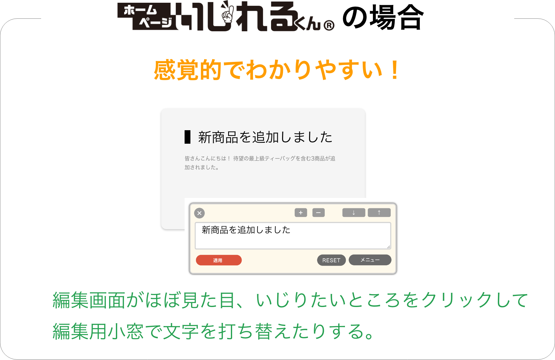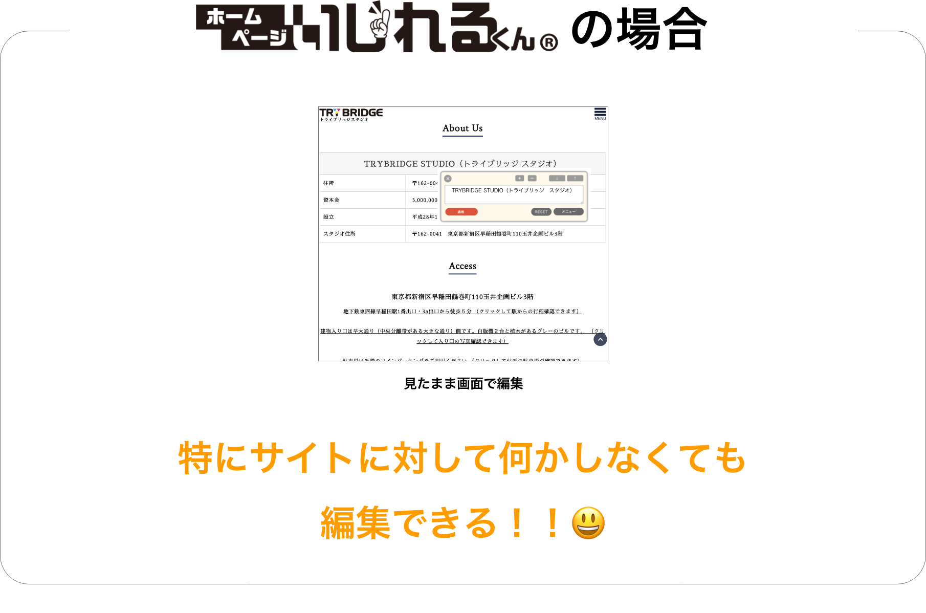 今あるホームページを誰でも簡単に後付けで編集できるようにという目的で開発された「ホームページいじれるくん®︎」というCMSがあるんですが、今あるページを編集、つまり色々書き換えたり画像入れ替えたり、っていうのがメインなのですが、