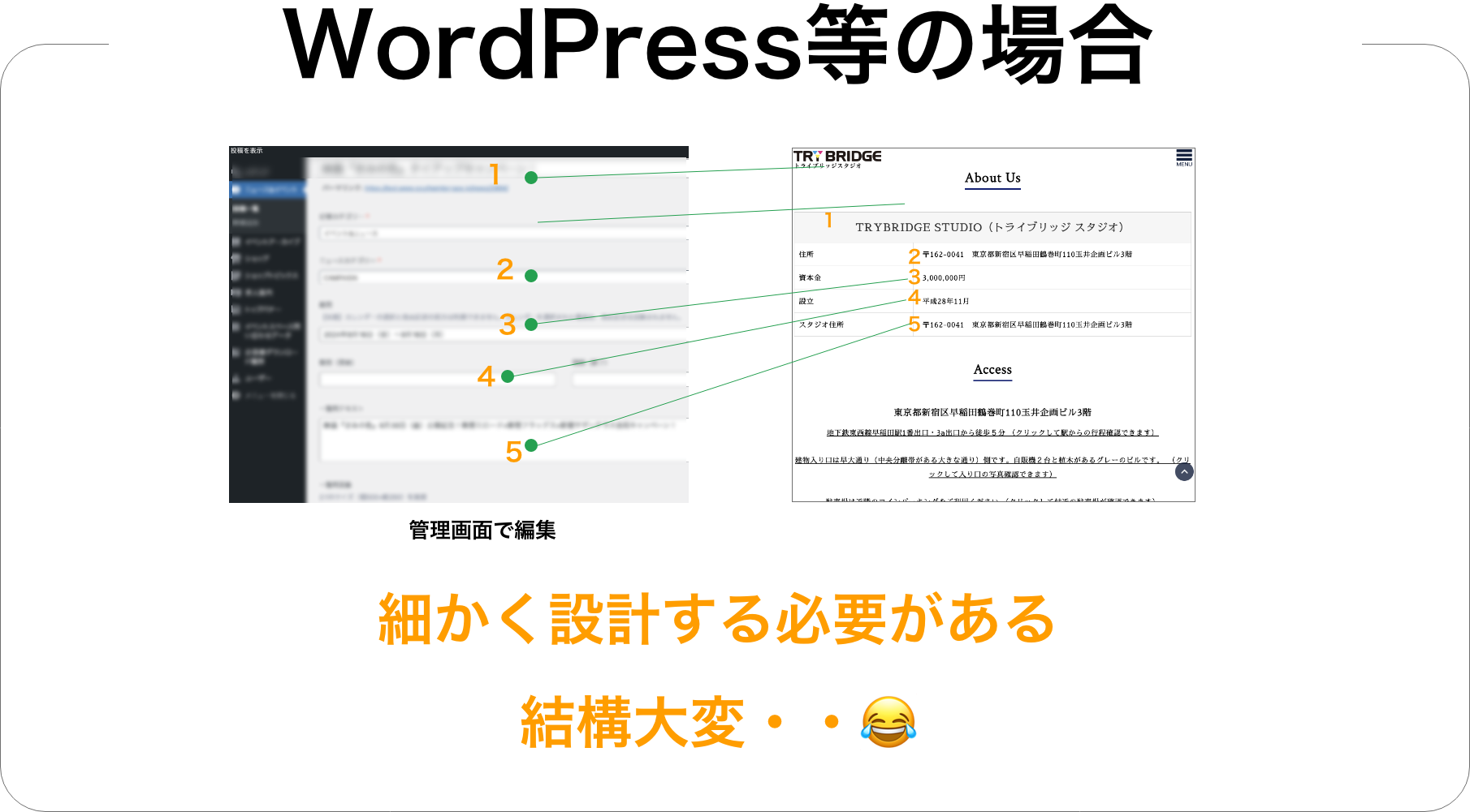 CMSを入れるってなると、デザインしてコーディングしたデータに対してさらに手を加えて開発作業が必要になりますよね。